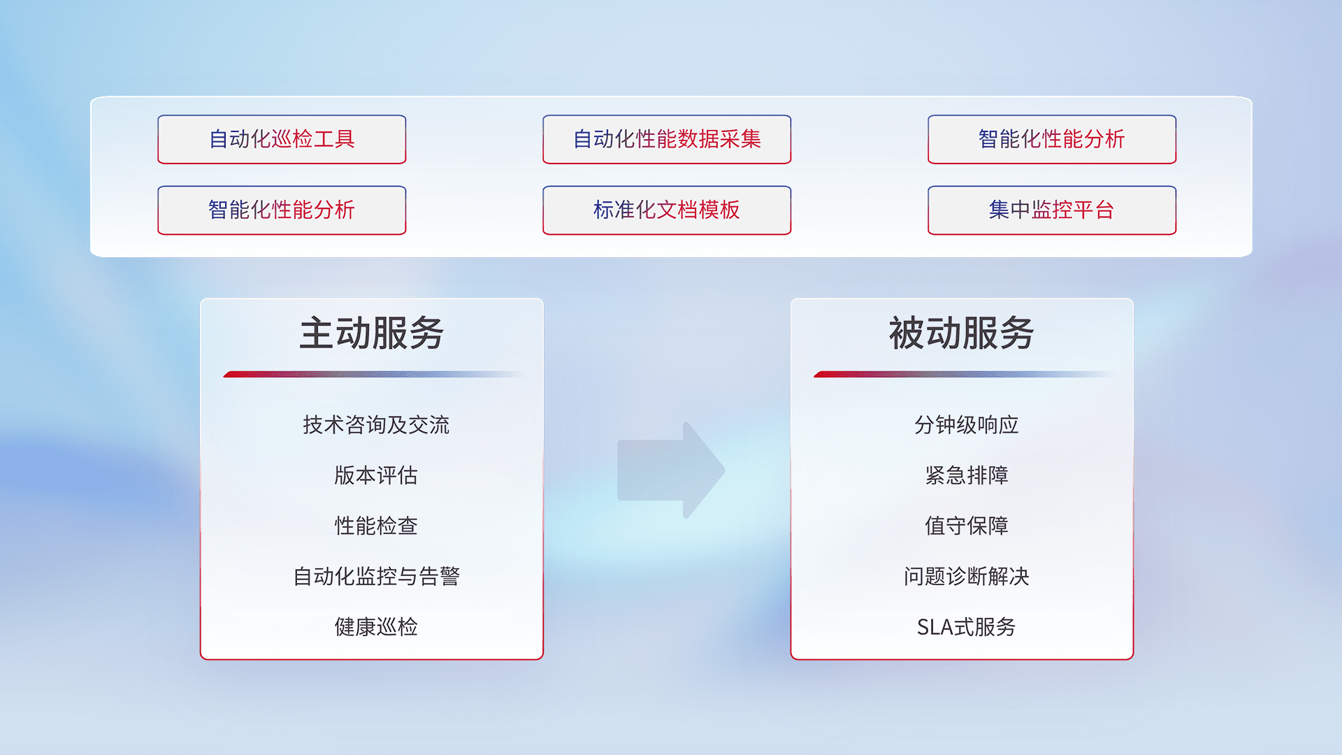 智能化工具和标准化文档,,,保障服务质量,,,提供主动服务(包含技术咨询、、、版本评估、、性能检查、、、、自动化监控与告警、、、、健康巡检)和被动服务包含(分钟级响应、、、紧急排障、、值守保障、、、、问题诊断解决、、、、SLA服务)。。。